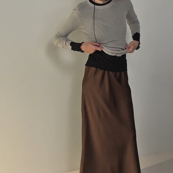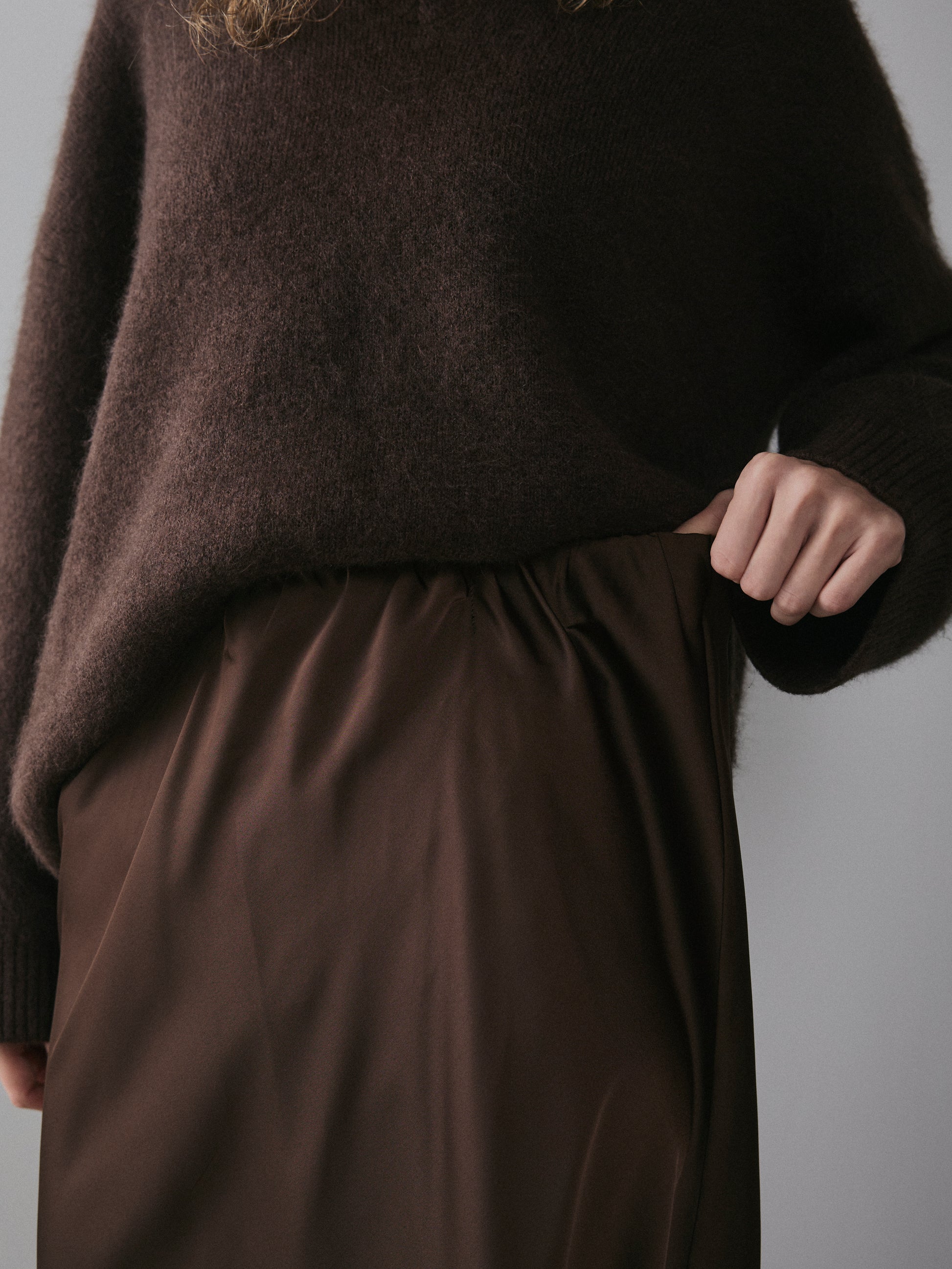 上品なサテンを使用し、上質な光沢が魅せる洗練されたナロースカートはすっきりとしたデザインと、生地のストンとした落ち感が特徴。身体のラインを拾いすぎず、動きのある優雅で洗練された雰囲気を演出してくれます。 見た目は上品ながら、ウエストはゴム仕様で穿き心地はノーストレス。主張しすぎないデザインなので、ボリュームニットからカジュアルなTシャツまで、幅広いトップスに合わせやすくシーズンレスで着回しの効く優秀な一本です。