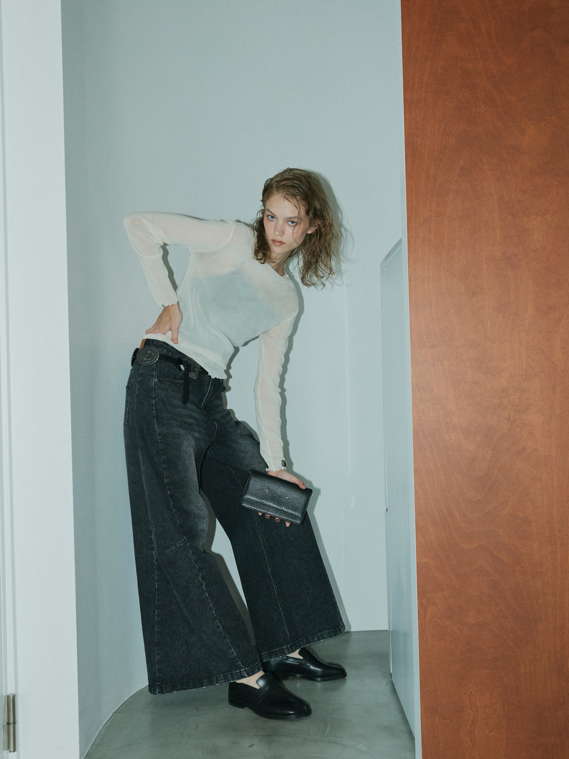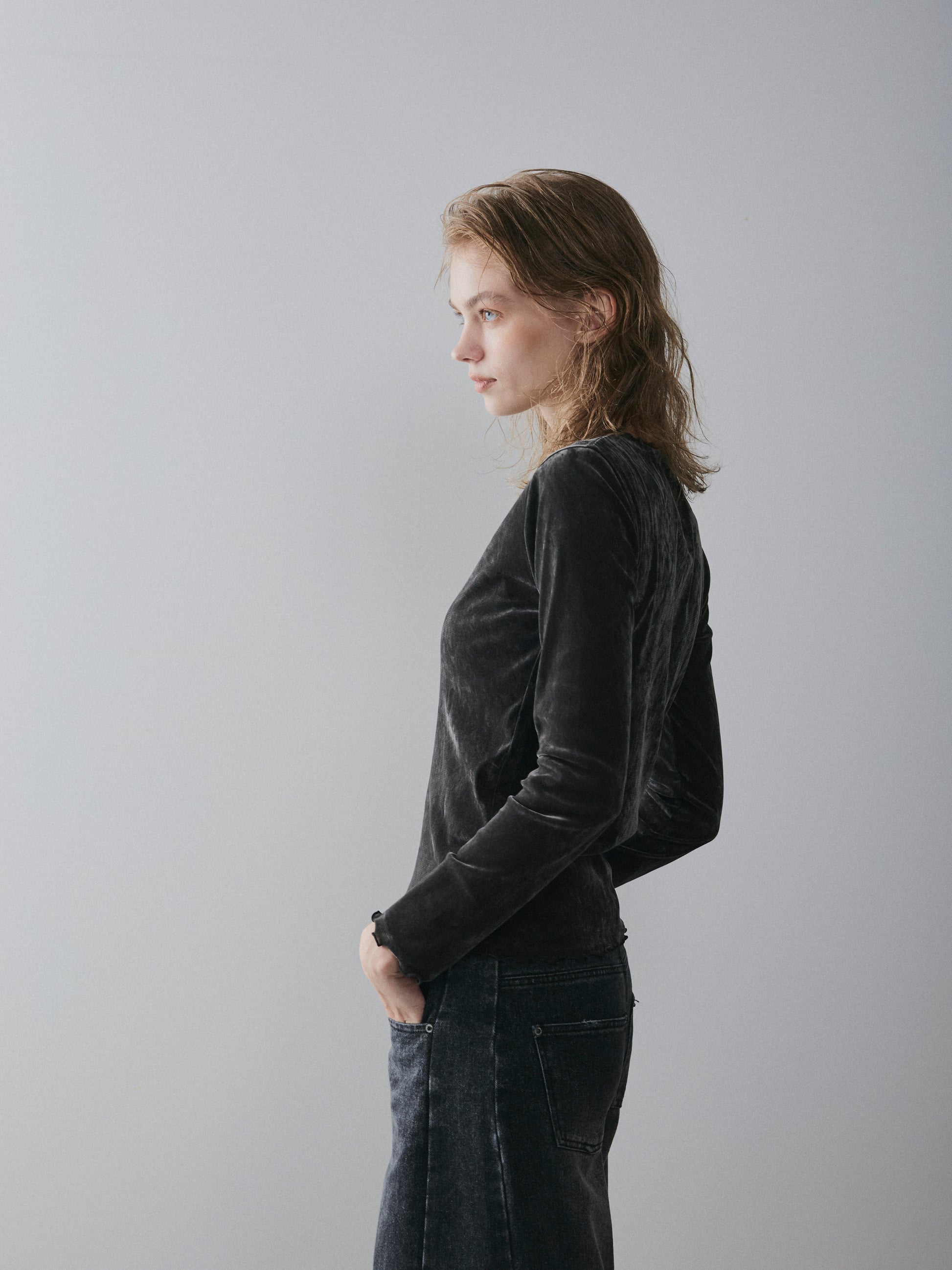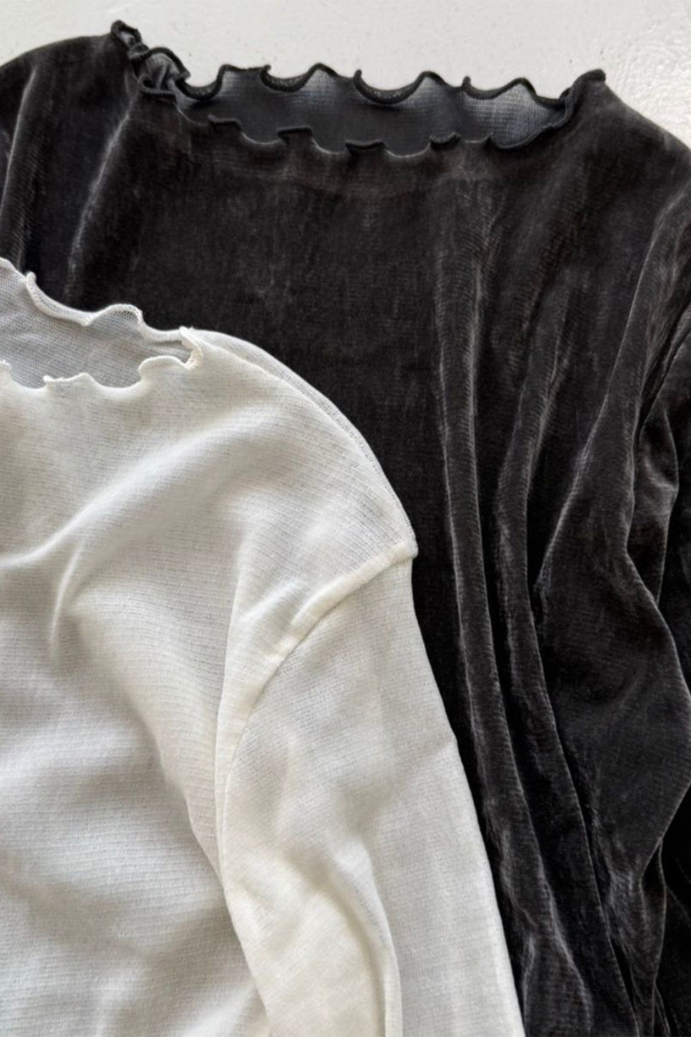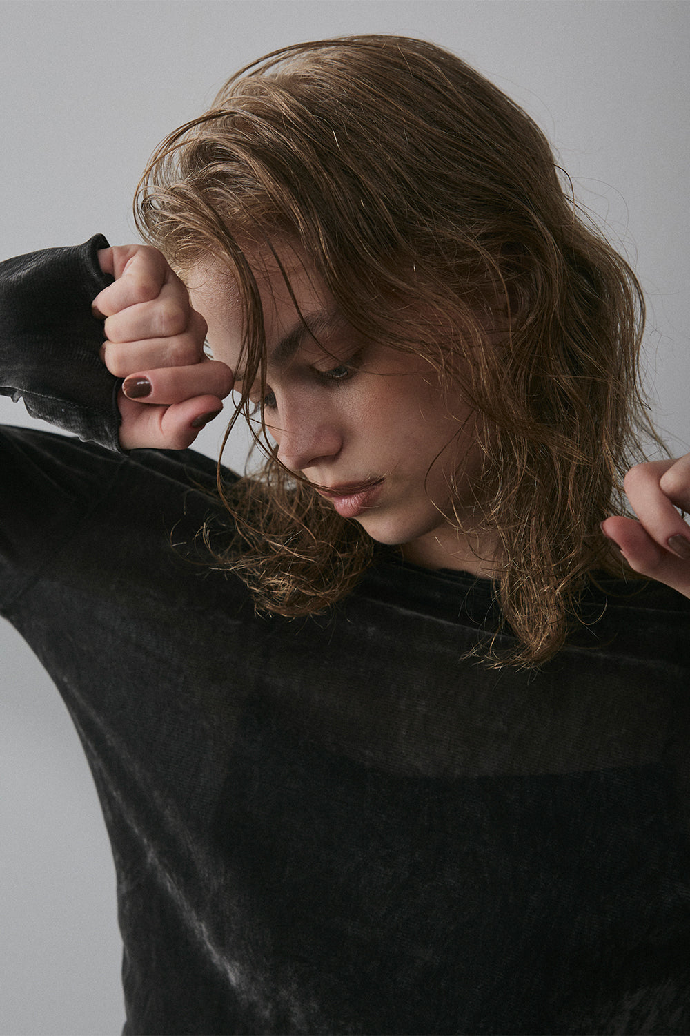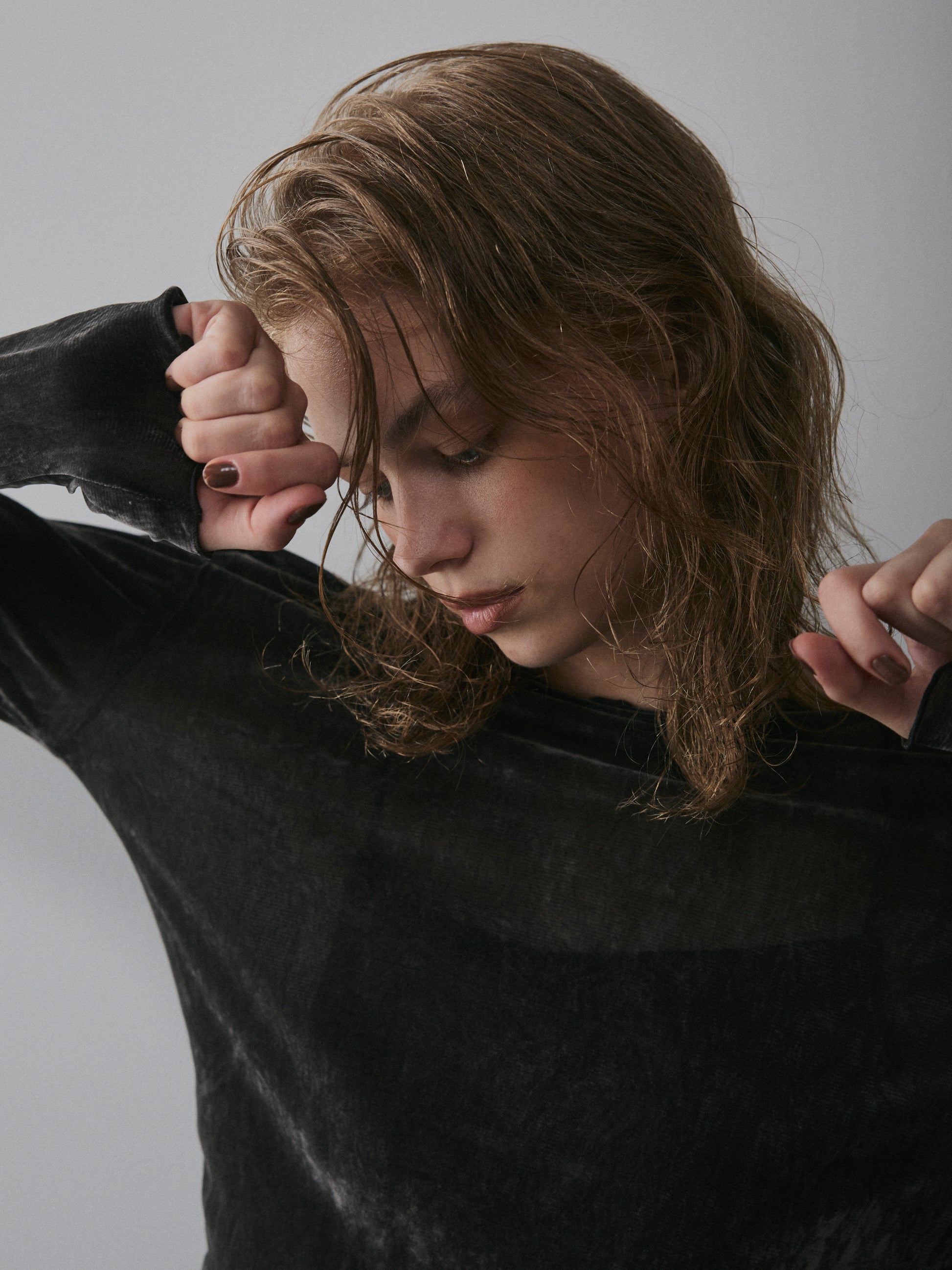 着こなしに深みとトレンド感をプラスするシアー素材のトップス。繊細なシアーの透け感に、ベルベットのようなフロッキー加工。フロッキー素材特有の光沢感がポイントになり1枚でも華やかに着ていただけます。程よい薄さなのでニットやジャケットのインナーとしても大活躍です。 またハイネックデザインで冬のレイヤードに最適な1枚。