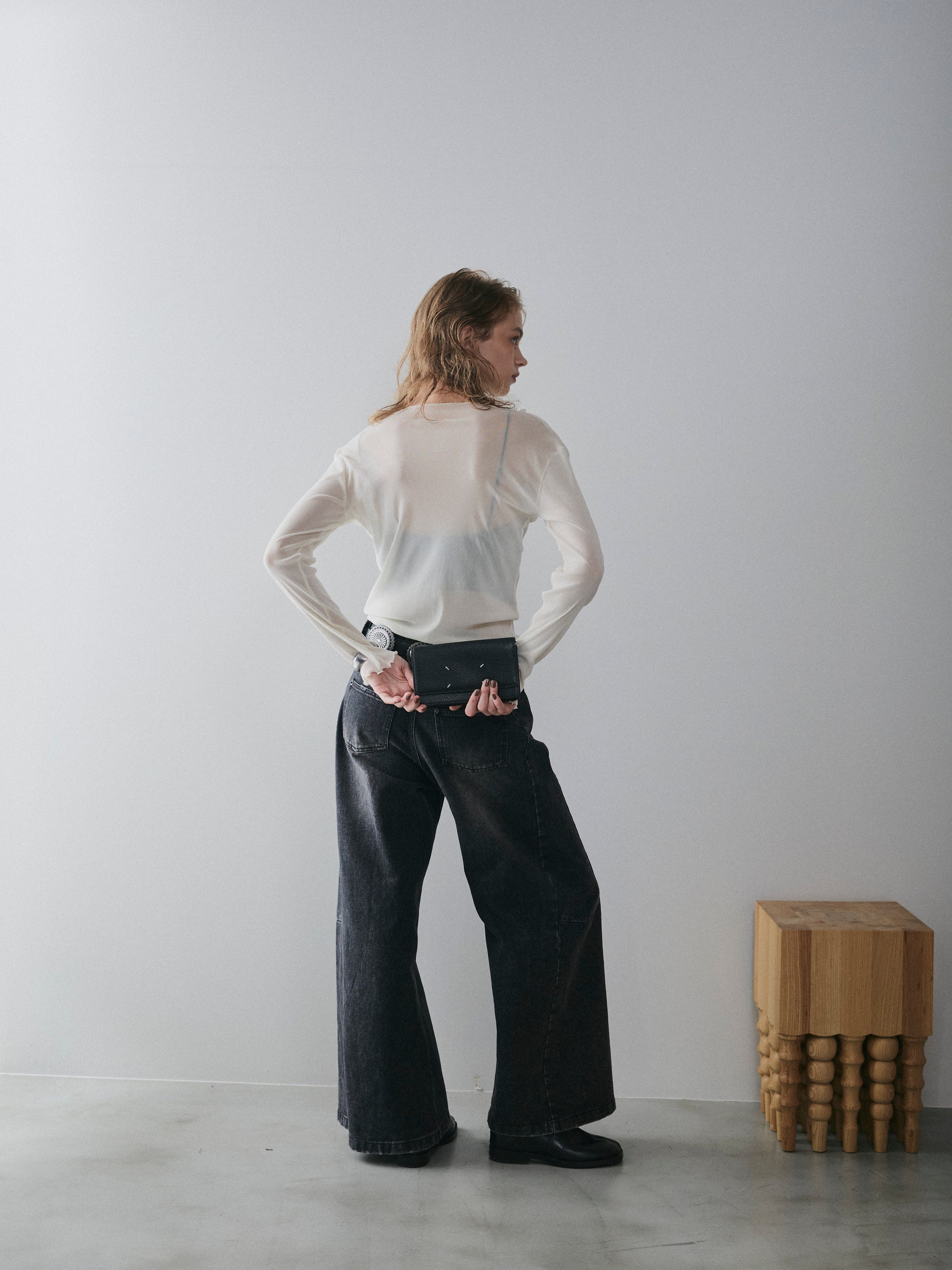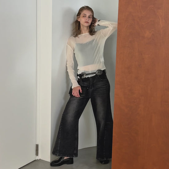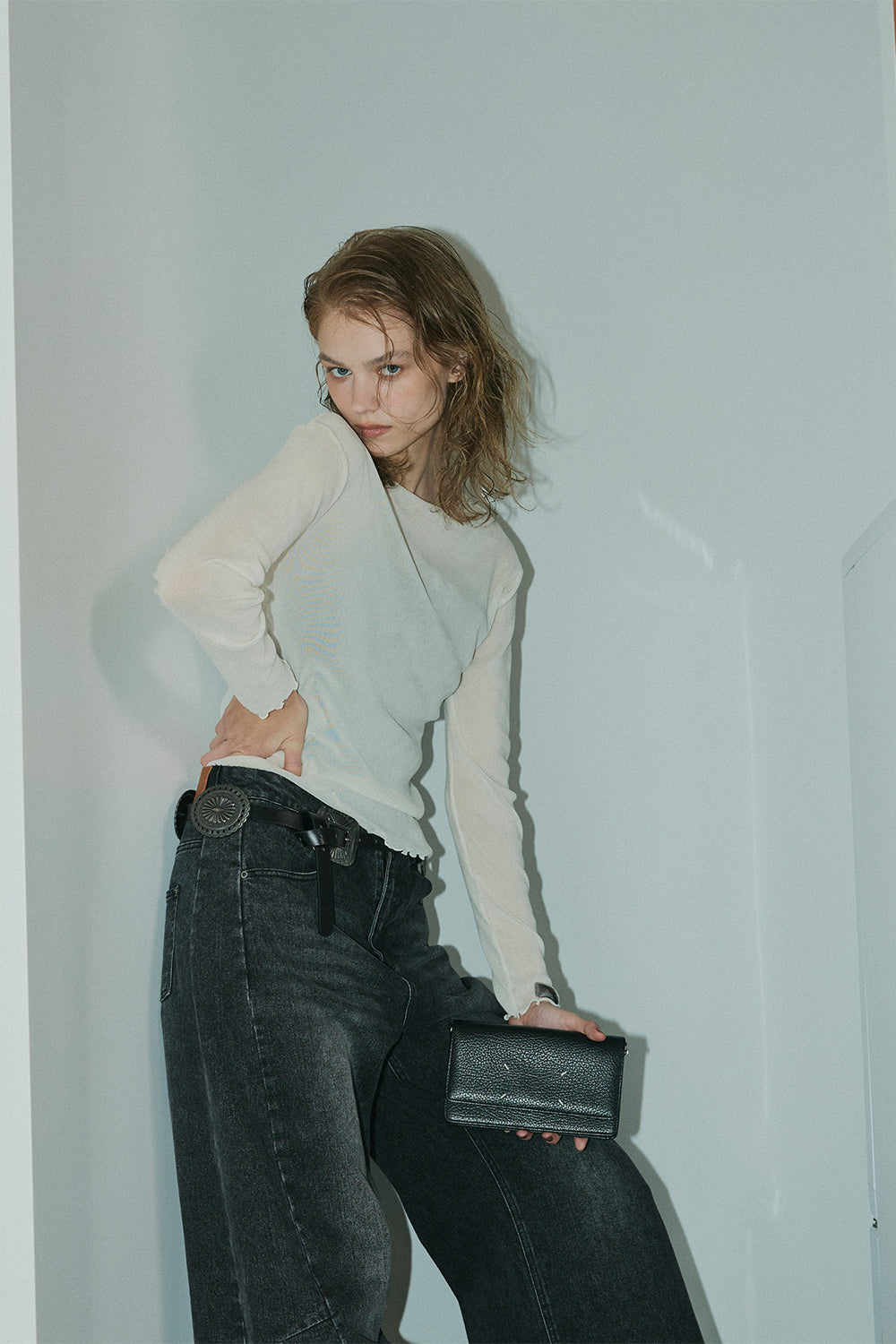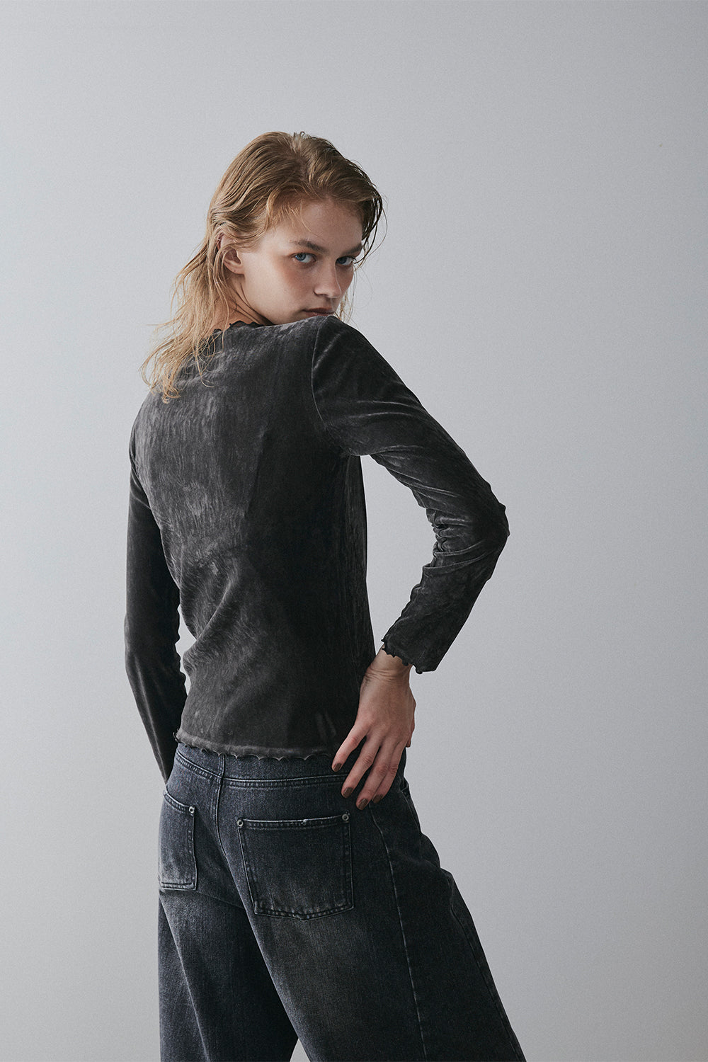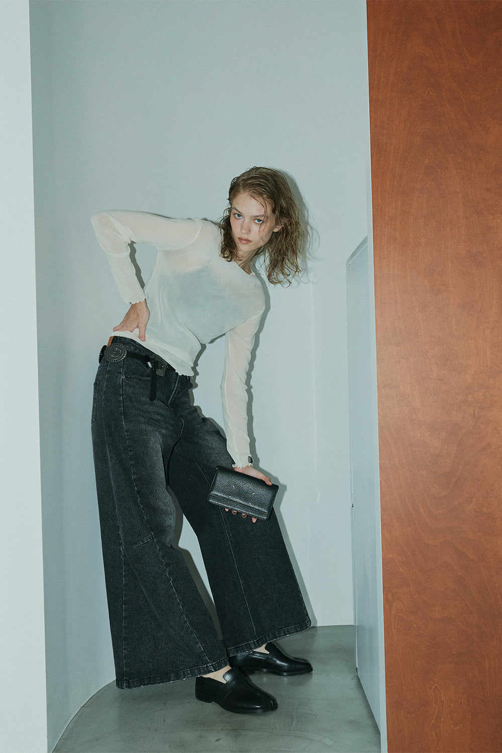 着こなしに深みとトレンド感をプラスするシアー素材のトップス。繊細なシアーの透け感に、ベルベットのようなフロッキー加工。フロッキー素材特有の光沢感がポイントになり1枚でも華やかに着ていただけます。程よい薄さなのでニットやジャケットのインナーとしても大活躍です。 またハイネックデザインで冬のレイヤードに最適な1枚。