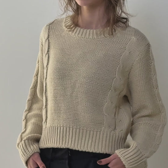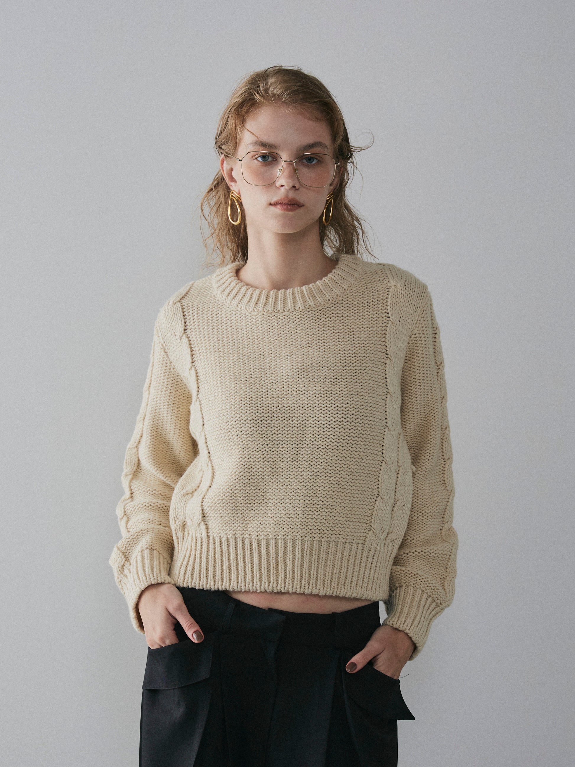 秋冬の定番であるケーブルニットに大人の遊び心をプラスしたデザインニット。 クラシックなケーブルニットの表情はそのままに、短丈のバランスにアップデート。目をひく大胆に開いた背中のデザインと、華奢な編み上げディテールがポイント。 背中の開きは、ロンTやキャミ、インナー次第で個性を活かしたスタイリングが可能です。