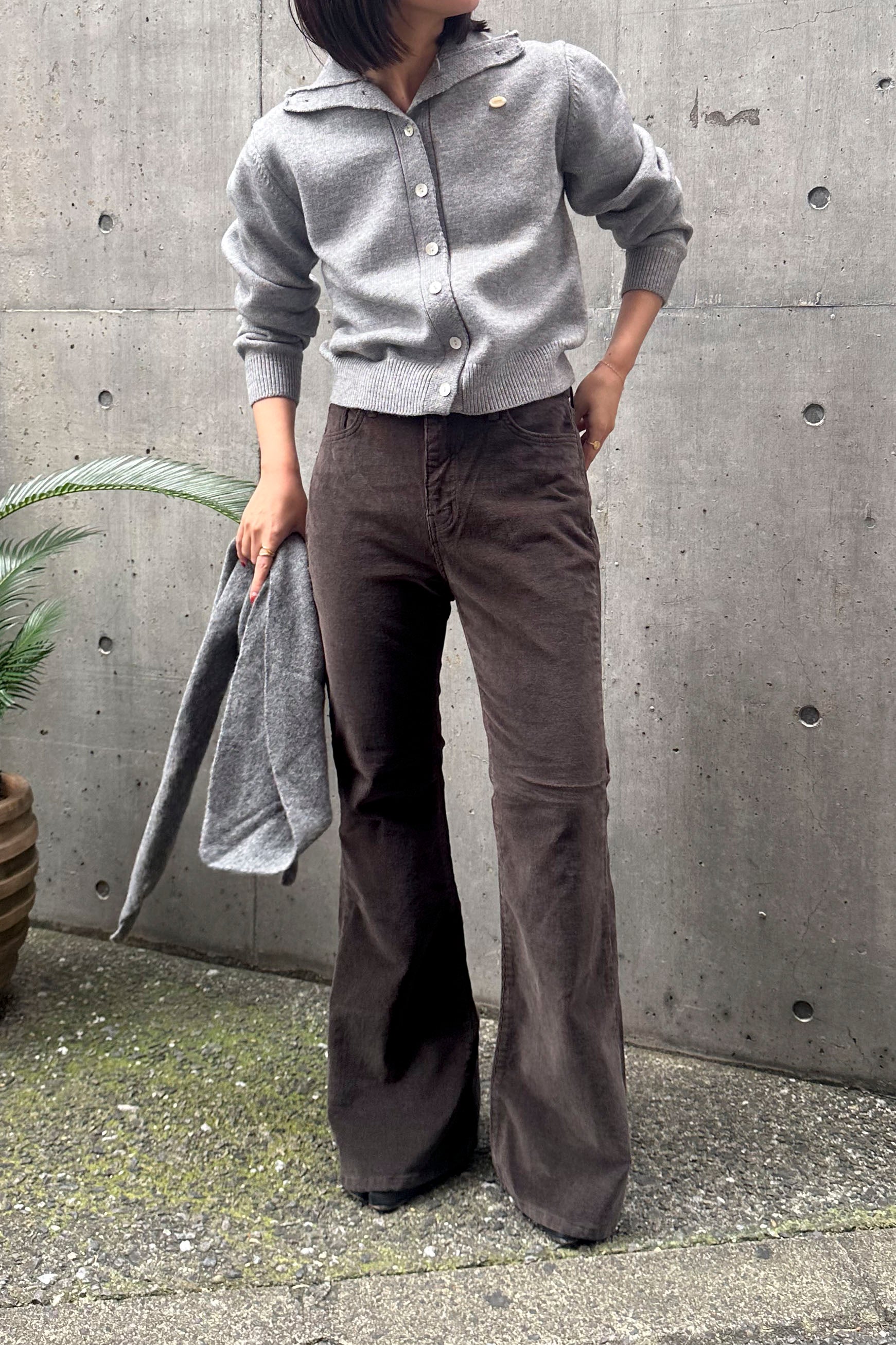 畝(うね)の細かい薄手のコーデュロイ素材を使用。カジュアルになりすぎず、きれいめなムードで穿ける一本です。 裾に向かって緩やかに広がるフレアシルエットが、脚のラインをまっすぐ長く、美しく演出します。 コーデュロイ特有の暖かみは保ちつつ、ごわつかない薄手の生地感で穿き心地も抜群。 秋冬の着こなしに洗練された表情を添える、マストハブなパンツです。