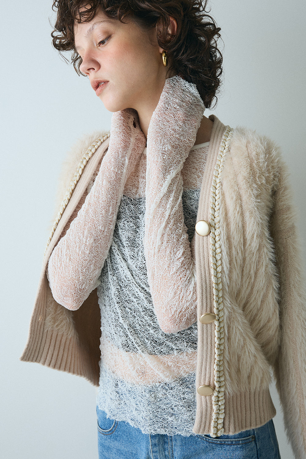 包み込まれる心地よさ、なめらかファーの主役級カーデ 襟元にはロープ風のテープを施し、リッチな素材にさりげないデザインアクセントをプラス。 カーディガンなので、1枚でも、羽織りでも使える華やか万能アイテムです