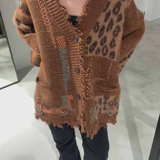 ヴィンテージムード纏う、プレイフルなカーディガン。 まるで古着のような味わい深いヴィンテージムードを放つ、主役級のオーバーサイズカーディガンです。 さりげなく配置されたレオパード柄のパッチワークが、着こなしにインパクトと遊び心をプラス。 ざくっと羽織れるオーバーサイズシルエットは、肌寒い日のアウター代わりとしても活躍。 シンプルなインナーに重ねるだけで、ぐっと差のつくスタイルが完成します。