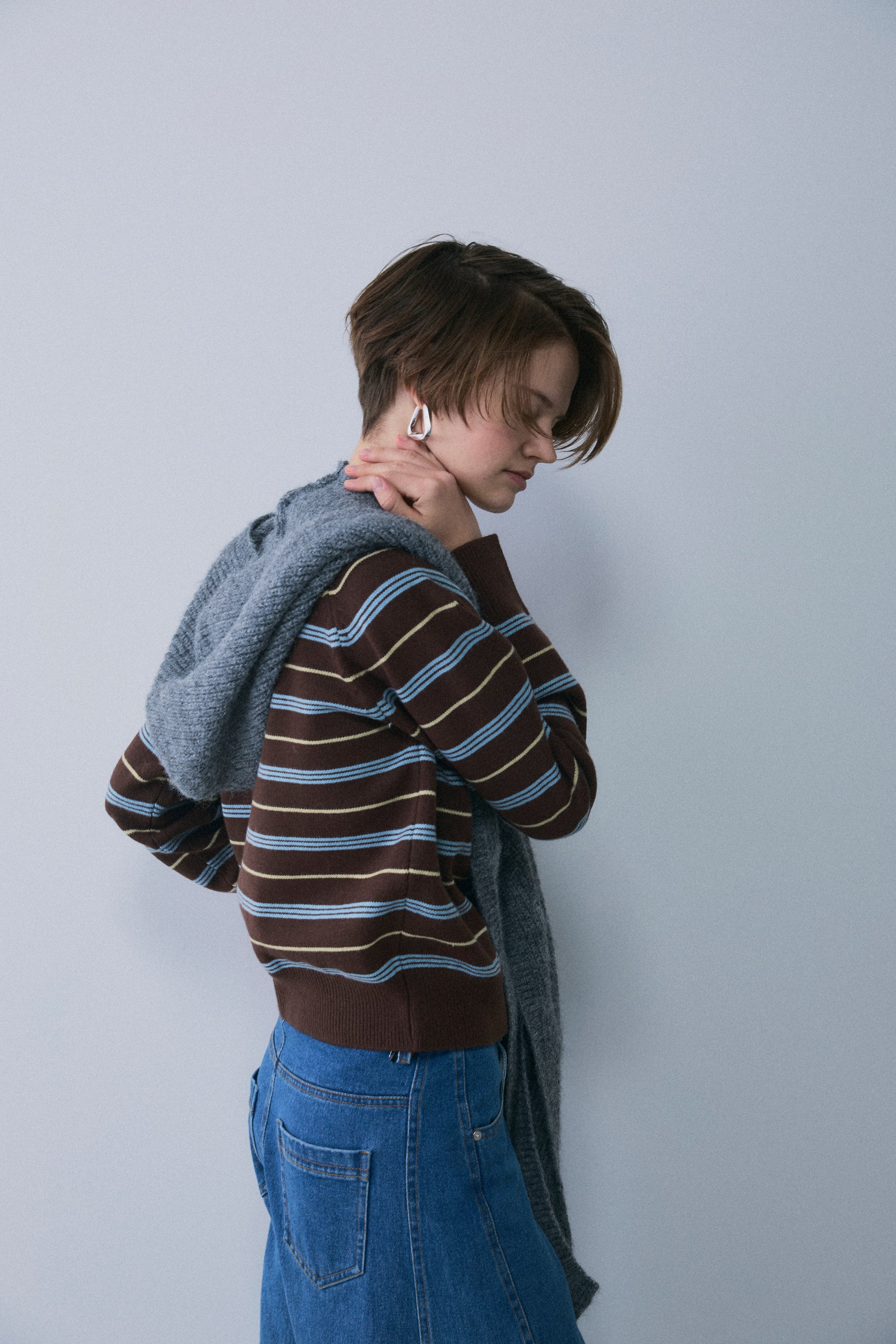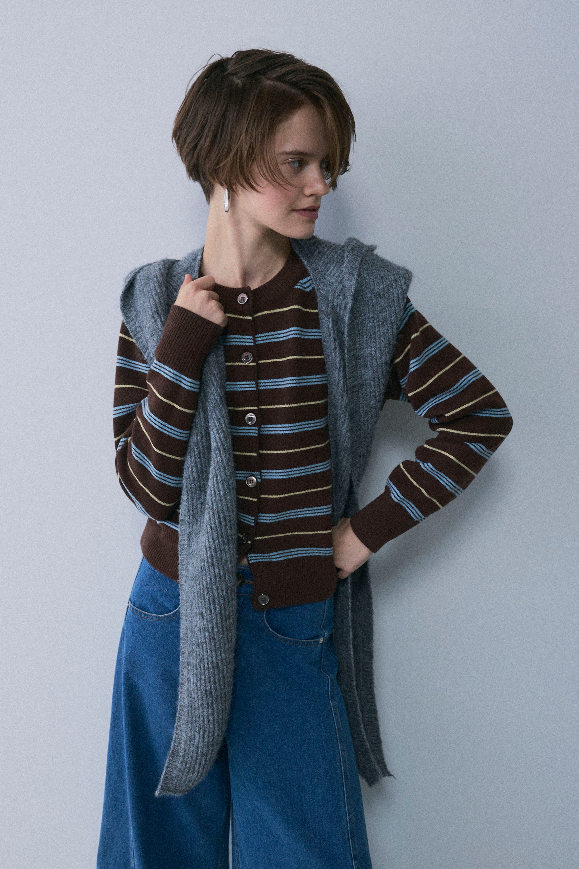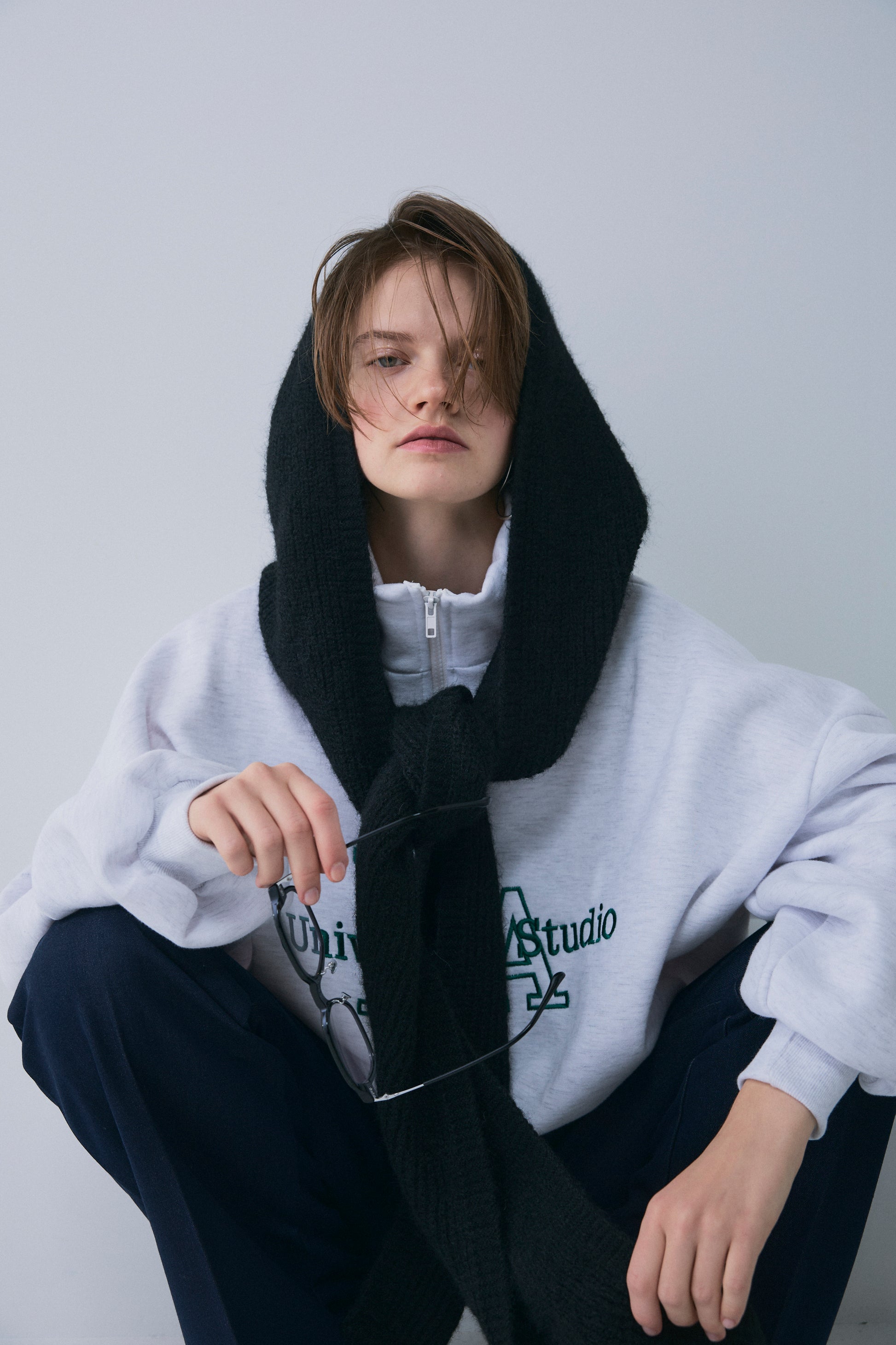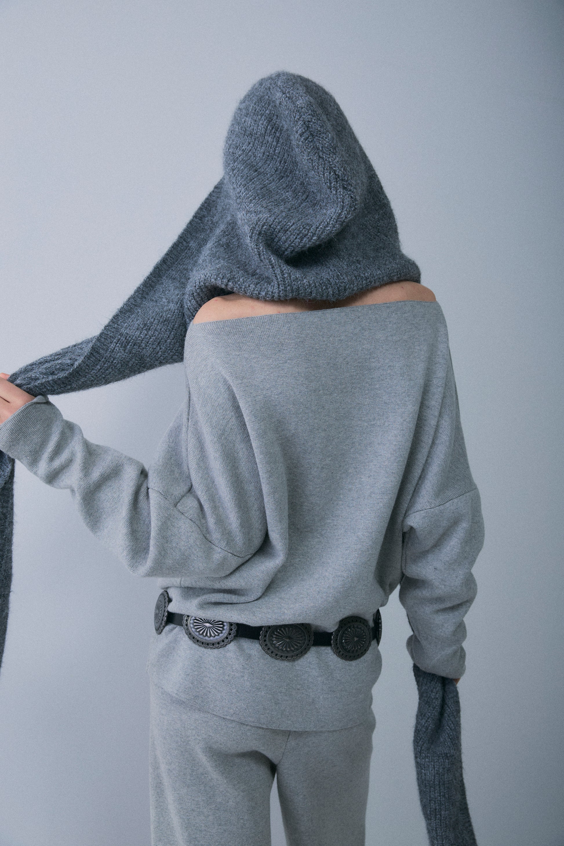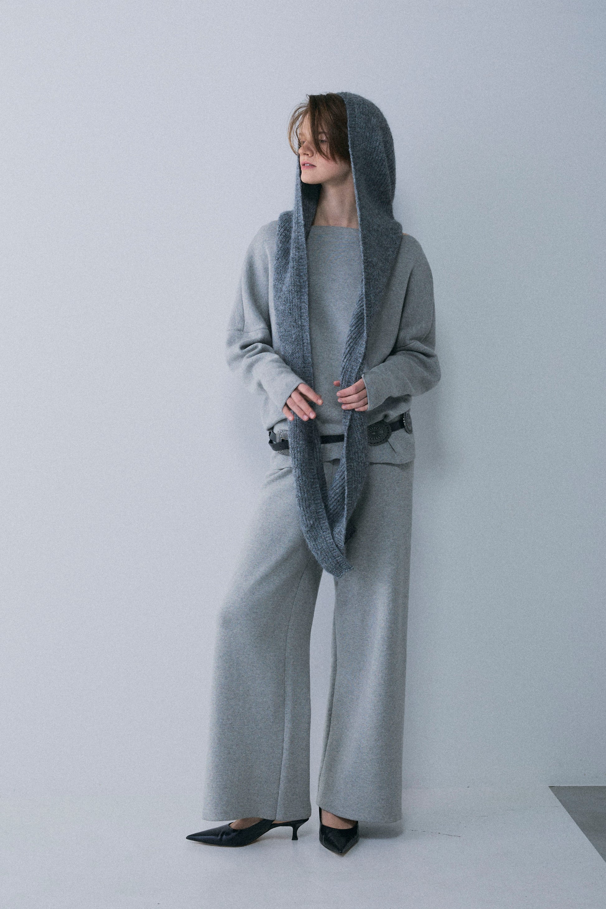 スタイルを即座に格上げする、フード付きデザインのロングニットストール。 巻くだけで小顔効果と旬のムードを両立し、トレンドのバラクラバのようなイメージで使えるボリューム感が魅力。
