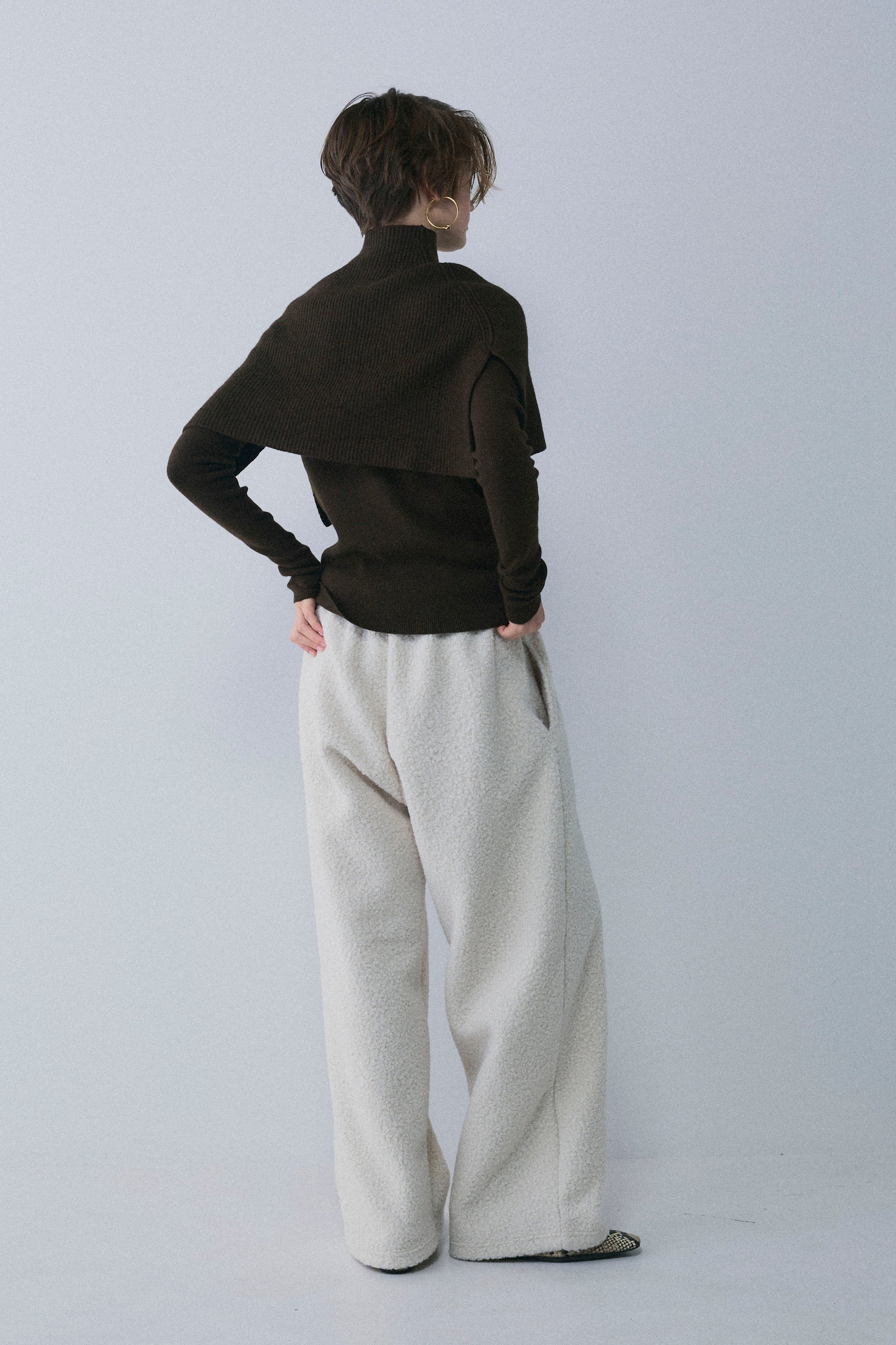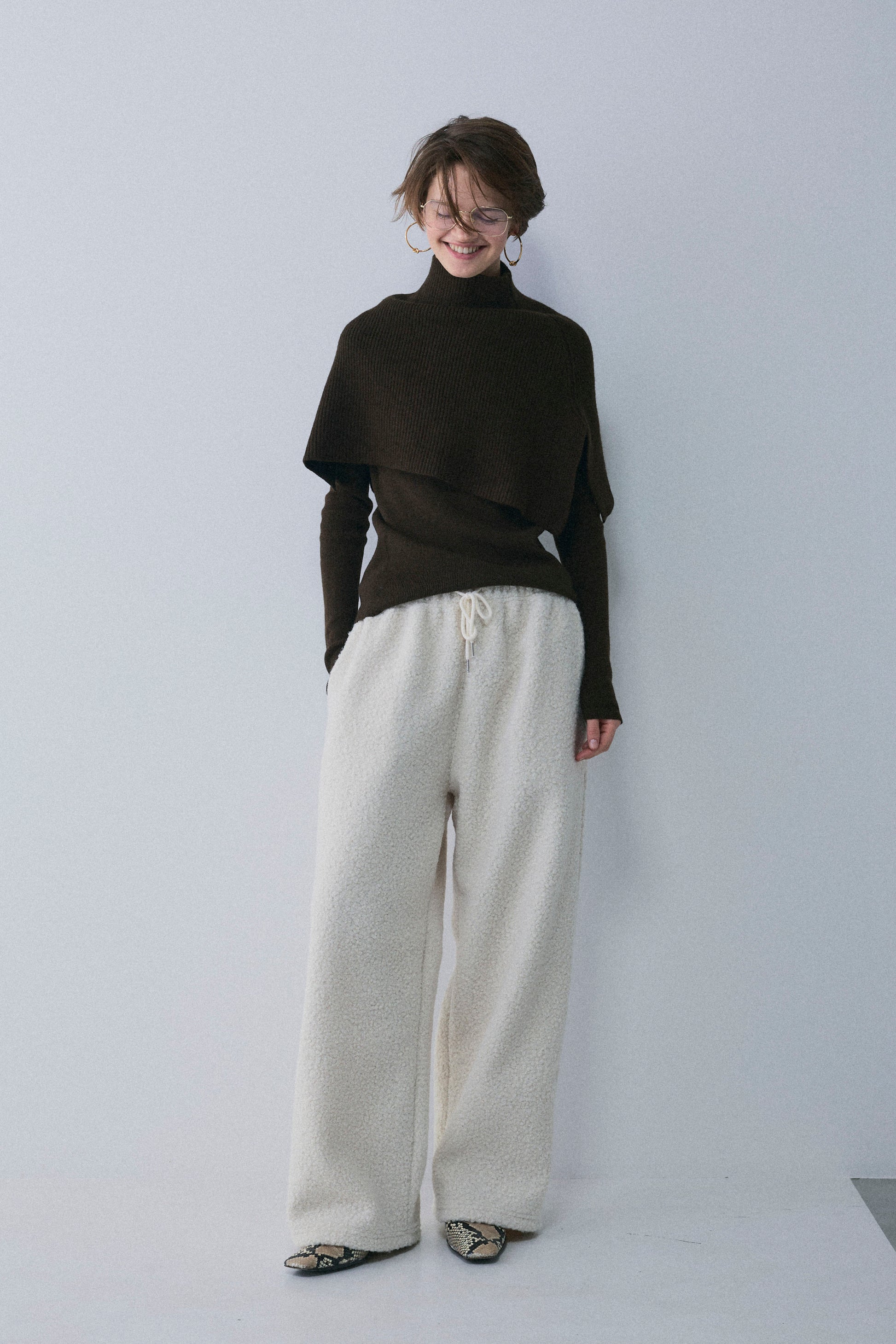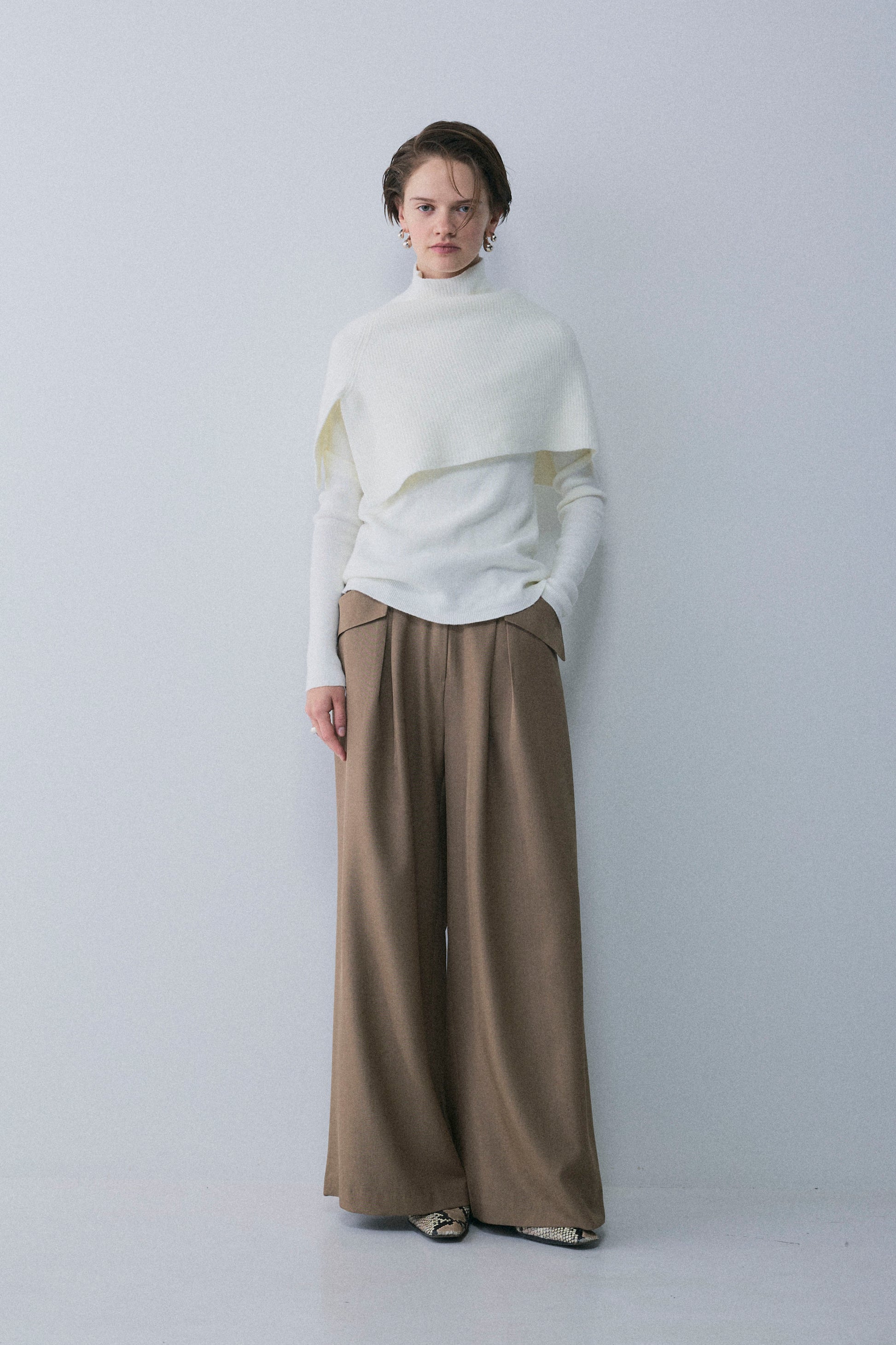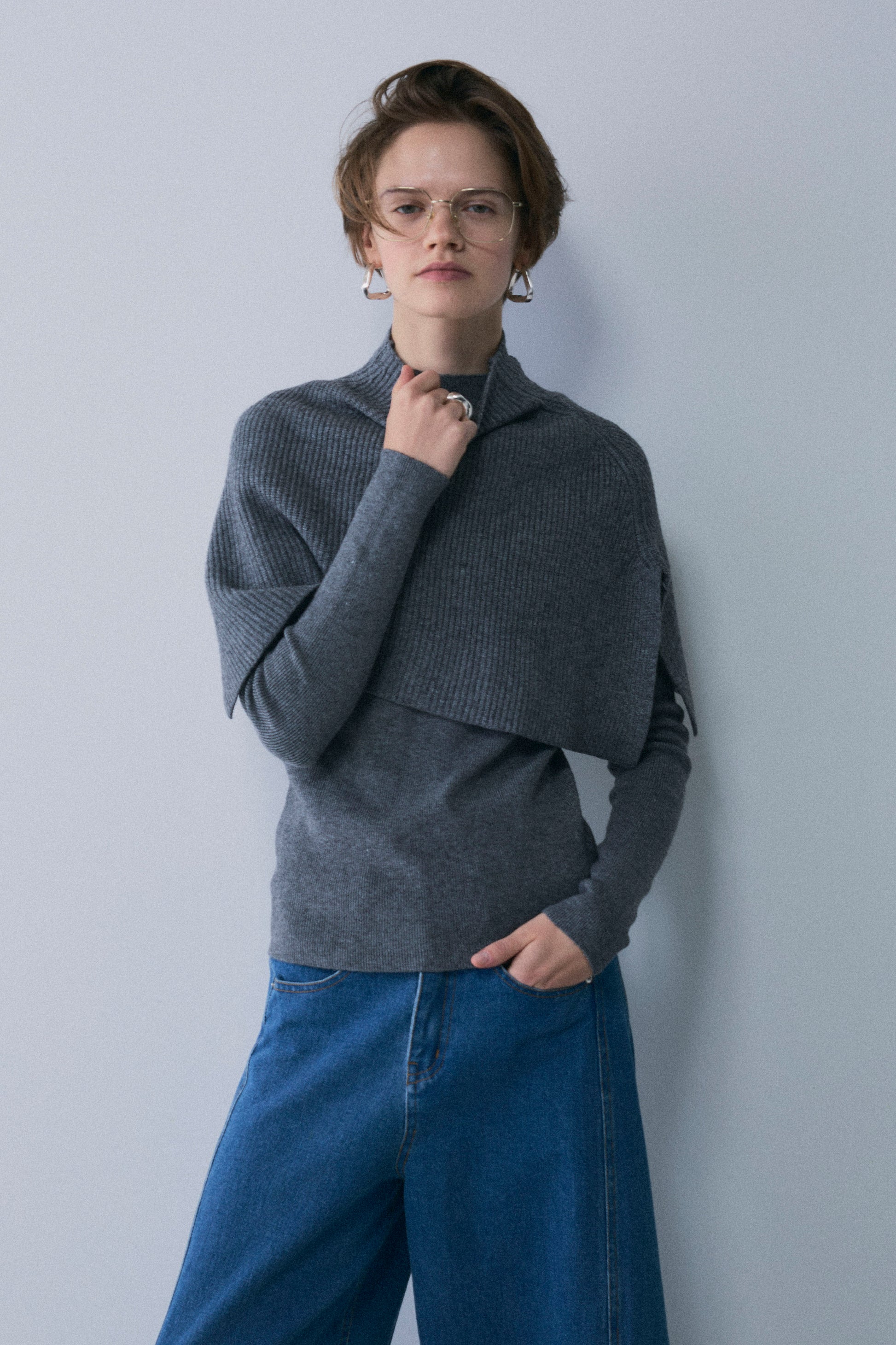 同色のニットケープが、シンプルなリブトップスに旬なレイヤードムードを添えるセットアイテム。 ケープをプラスすればモードに、外せばベーシックに、着こなしの幅が劇的に広がる。 このセット一つで、洗練された大人のおしゃれが簡単に手に入る。